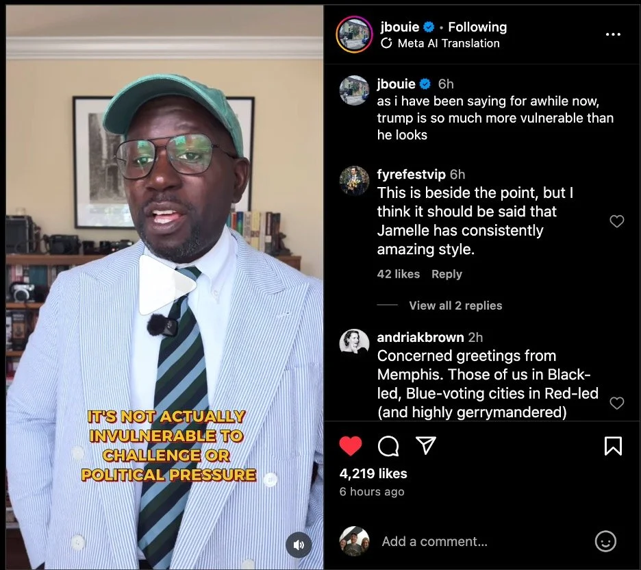 [16] Jamelle Bouie [@jbouie], Instagram, September 13, 2025, https://www.instagram.com/reel/DOjEPNmAOXT/?igsh=NTc4MTIwNjQ2YQ==