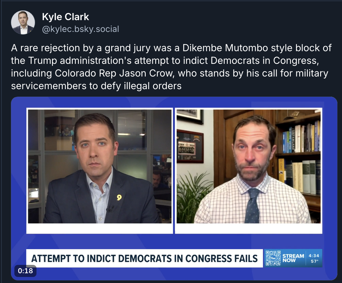 As Kyle Clark of NBC 9News Denver notes, “A rare rejection by a grand jury was a Dikembe Mutombo style block of the Trump administration's attempt to indict Democrats in Congress, including Colorado Rep Jason Crow, who stands by his call for military servicemembers to defy illegal orders.” [11]