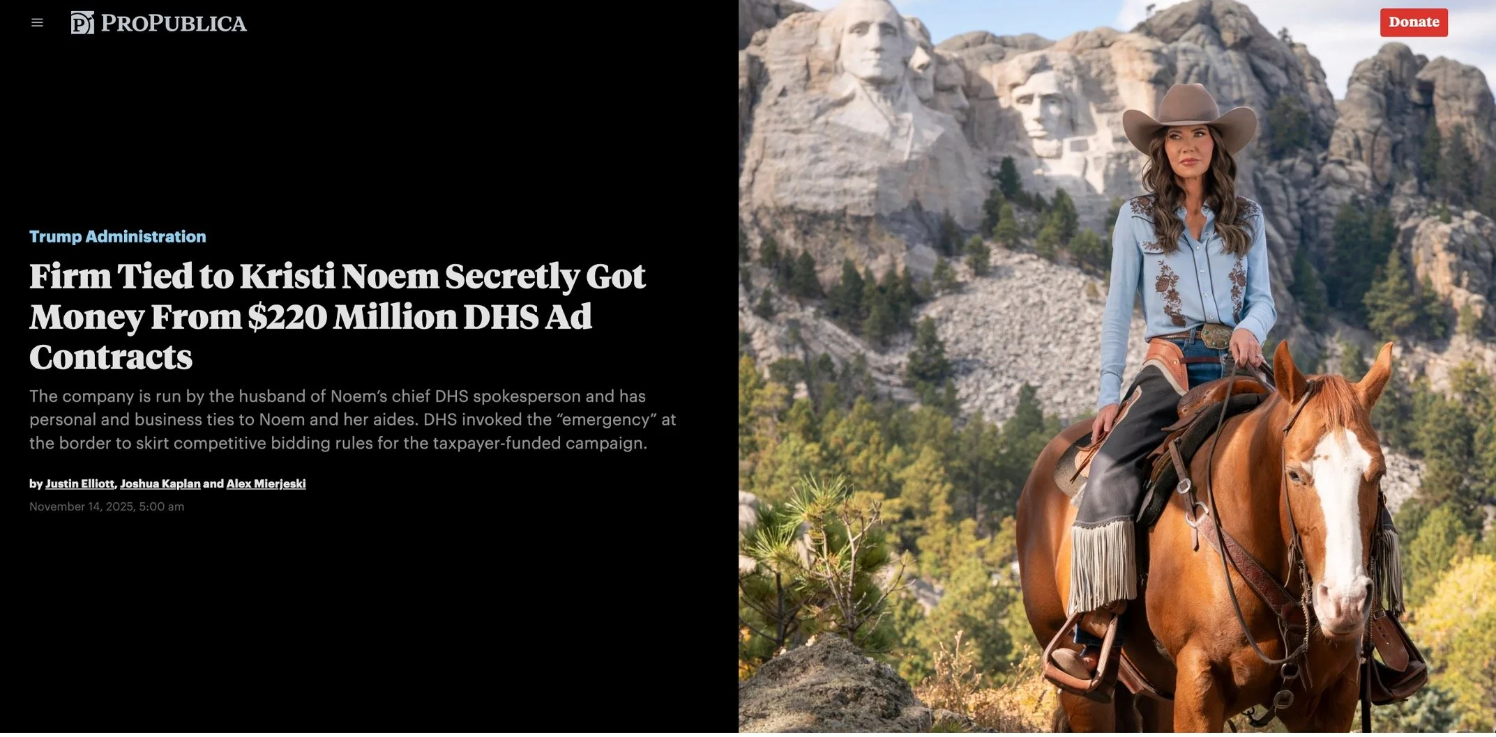 [7] Justin Elliott, Joshua Kaplan and Alex Mierjeski,” Firm Tied to Kristi Noem Secretly Got Money From $220 Million DHS Ad Contracts,” ProPublica, November 14, 2025, https://www.propublica.org/article/kristi-noem-dhs-ad-campaign-strategy-group